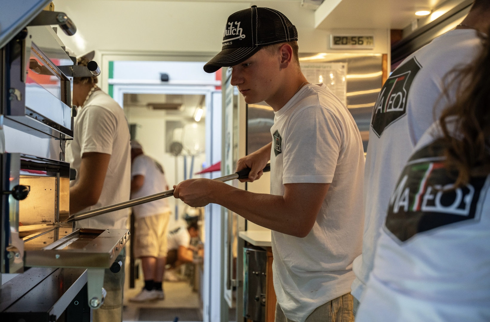 Am Schitterhof betreibt Matteo seinen Pizza-Foodtruck direkt am Platz — frische Pizza und gekühltes Bier, ohne Anstehen und ohne Gedränge. Ideal nach einem langen Showtag.